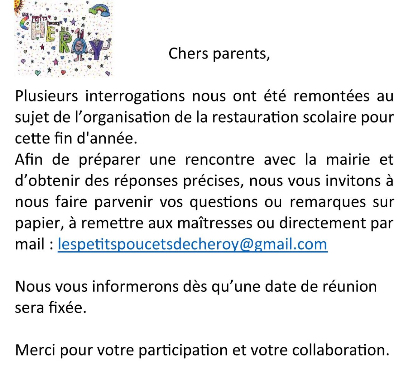 Ci-joint une communication de l'association "Les Petits Poucets de Chéroy" concernant la cantine.